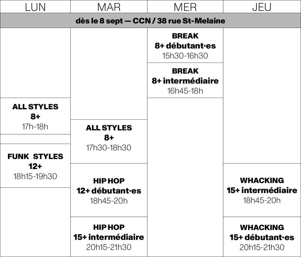 Encadrés par des artistes passionné·es et engagé·es, les cours s’adressent à toutes et tous, dès 8 ans, que tu sois débutant·e ou confirmé·e : whacking, funk styles, freestyle, break ou encore all styles… chaque séance est l’occasion de découvrir, d’échanger et d’apprendre.